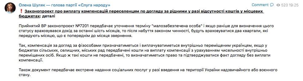 14 апреля Верховная Рада приняла как закон законопроект №7201 о выплате компенсаций переселенцам по уходу за родными при отсутствии средств в местных бюджетах.