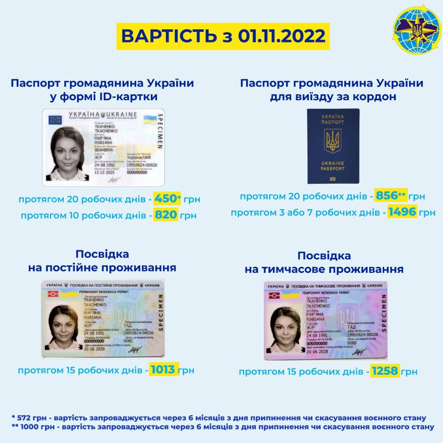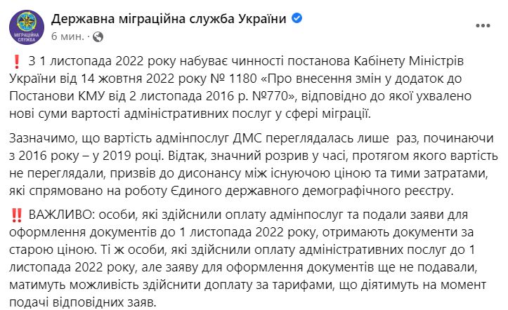 ВАЖЛИВО: особи, які здійснили оплату адмінпослуг та подали заяви для оформлення документів до 1 листопада 2022 року, отримають документи за старою ціною. Ті ж особи, які здійснили оплату адміністративних послуг до 1 листопада 2022 року, але заяву для оформлення документів ще не подавали, матимуть можливість здійснити доплату за тарифами, що діятимуть на момент подачі відповідних заяв», — сказано у повідомленні.